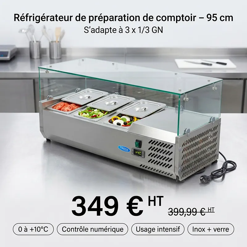 - Capacité : 3 bacs 1/3 GN en surface, accès immédiat aux ingrédients